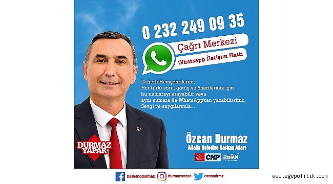 Vatandaşların istek, öneri ve görüşlerini bildirmeleri için WhatsApp iletişim hattını devreye sokan CHP Aliağa Belediye Başkan Adayı Özcan Durmaz, 0232 249 09 35 numaralı adresini sosyal medyadan duyurdu.